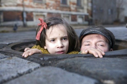 Robert Wieckiewicz plays Socha with conviction and and a rough sort of purity. His blocky face and burly torso give the impression of a man not given to giving up easily. Socha begins the story motivated purely by self-interest and by the end, he has become a sort of Polish Oskar Schindler.