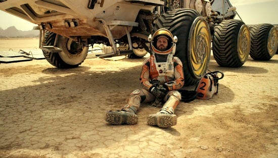There's a mission on Mars — third in a series of five, we're told — and botanist Watney and the others are waylaid by a massive storm that requires they blast off early and return home. Watney is whacked unconscious by some debris, the others believe him dead, and they have to leave before they themselves are killed.